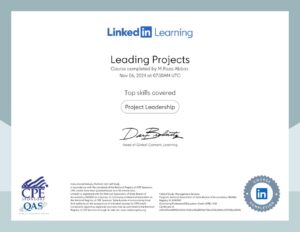 Muhammad Raza Abbas completed the Leading Projects course via LinkedIn Learning. Through this course, he enhanced his ability to initiate, plan, execute, monitor, and close projects effectively learning best practices for stakeholder management, risk mitigation, team coordination, and strategic leadership.