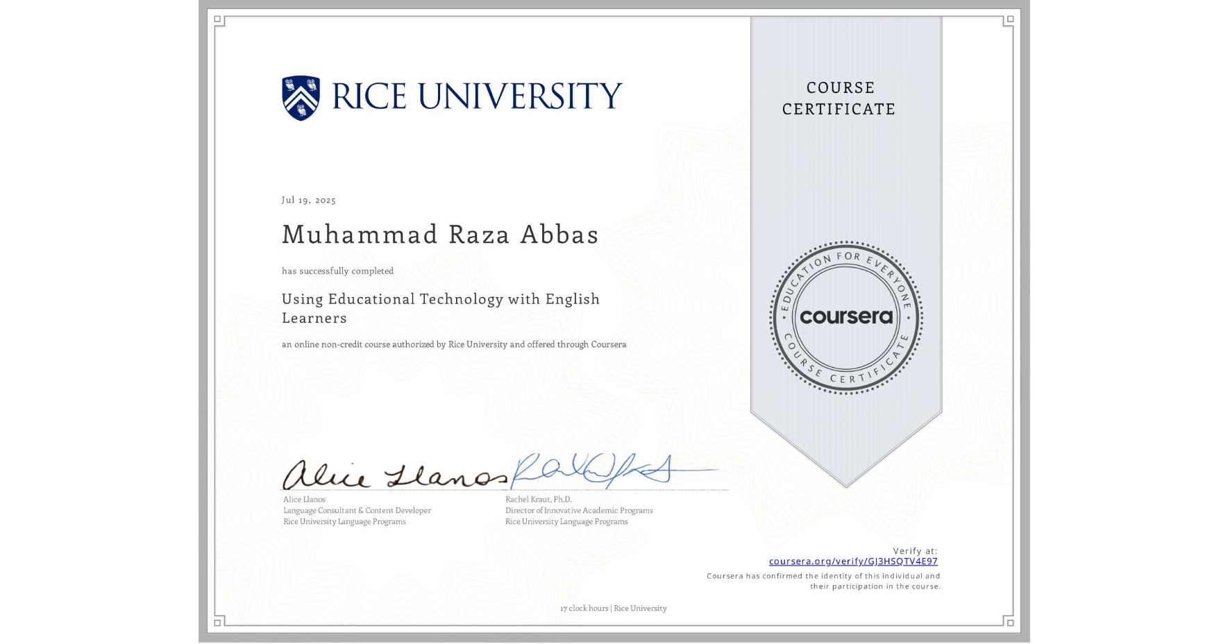Using Educational Technology with English Learners (RICE University) Certifications