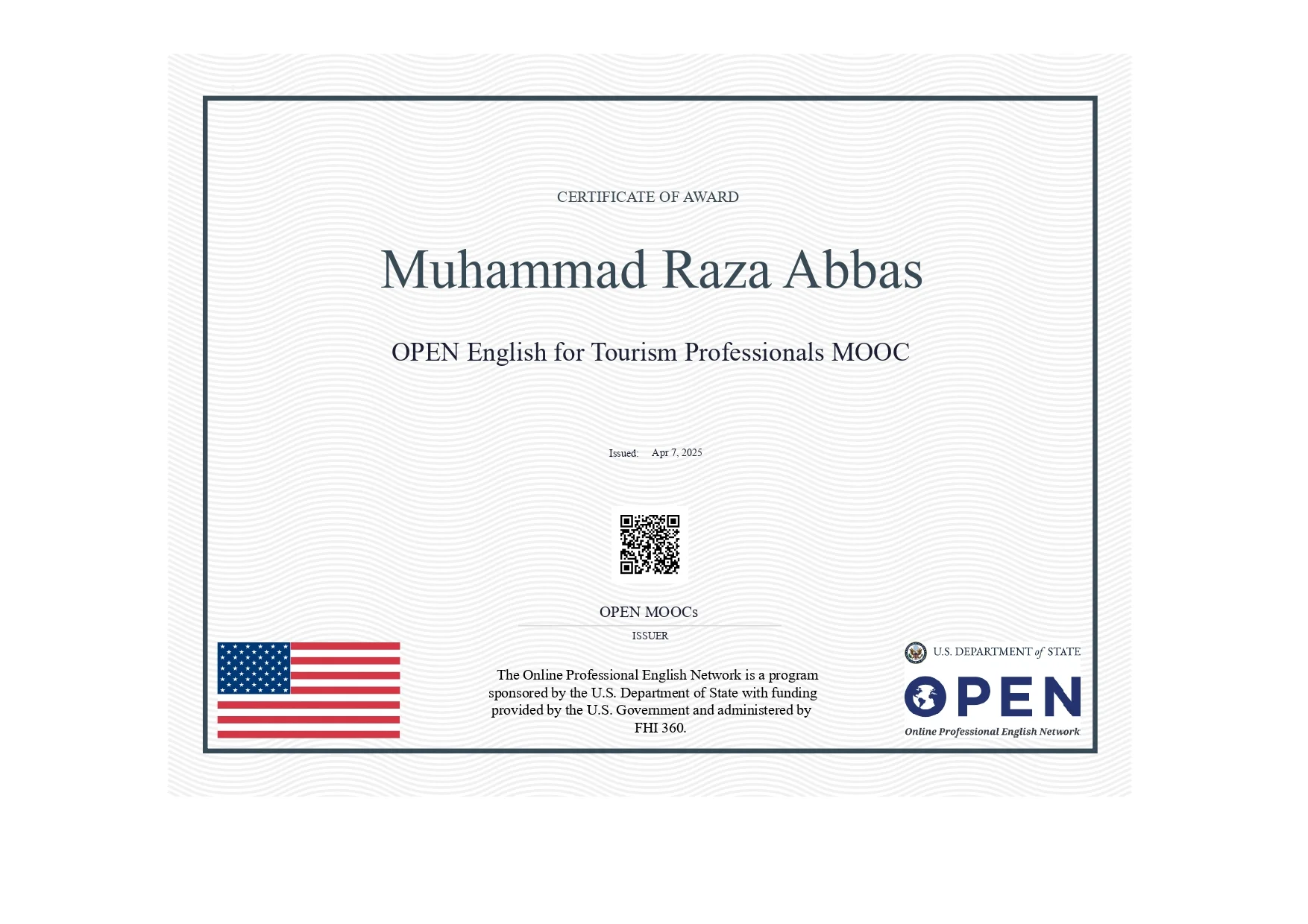OPEN English for Tourism Professionals MOOC Certifications